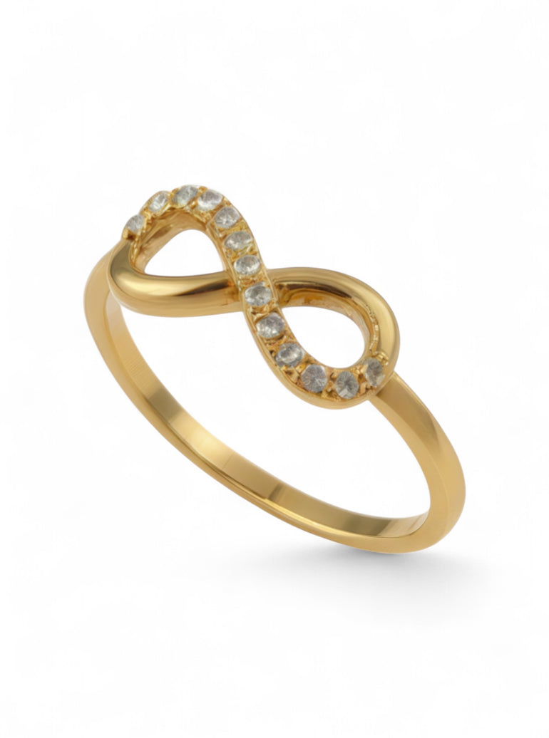 טבעת זהב בעיצוב אלגנטי ומודרני, בעלת חלק עליון בצורת אינפיניטי משובץ בזירקונים עגולים בוהקים. השיבוץ המדויק והקווים הזורמים של הדגם מעניקים לטבעת מראה עדין אך מרשים, המשדר אלגנטיות על-זמנית. שילוב הזהב הצהוב החמים עם הברק הלבן של הזירקונים יוצר ניגוד יוקרתי ומושך עין, ההופך את הטבעת למתאימה הן לשימוש יומיומי והן לאירועים מיוחדים.