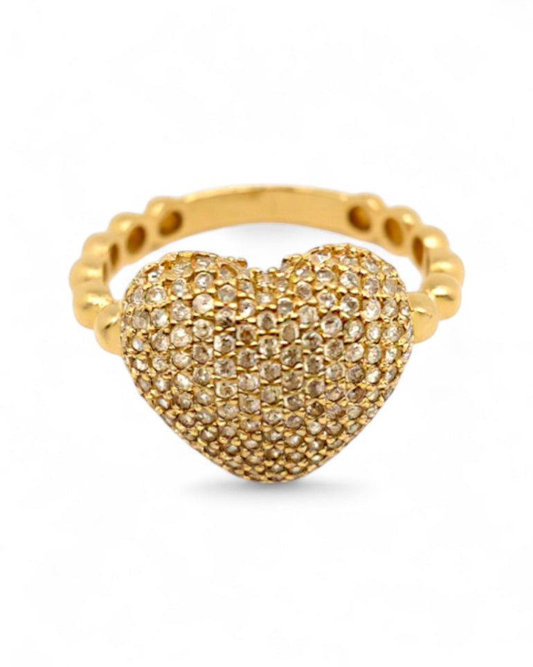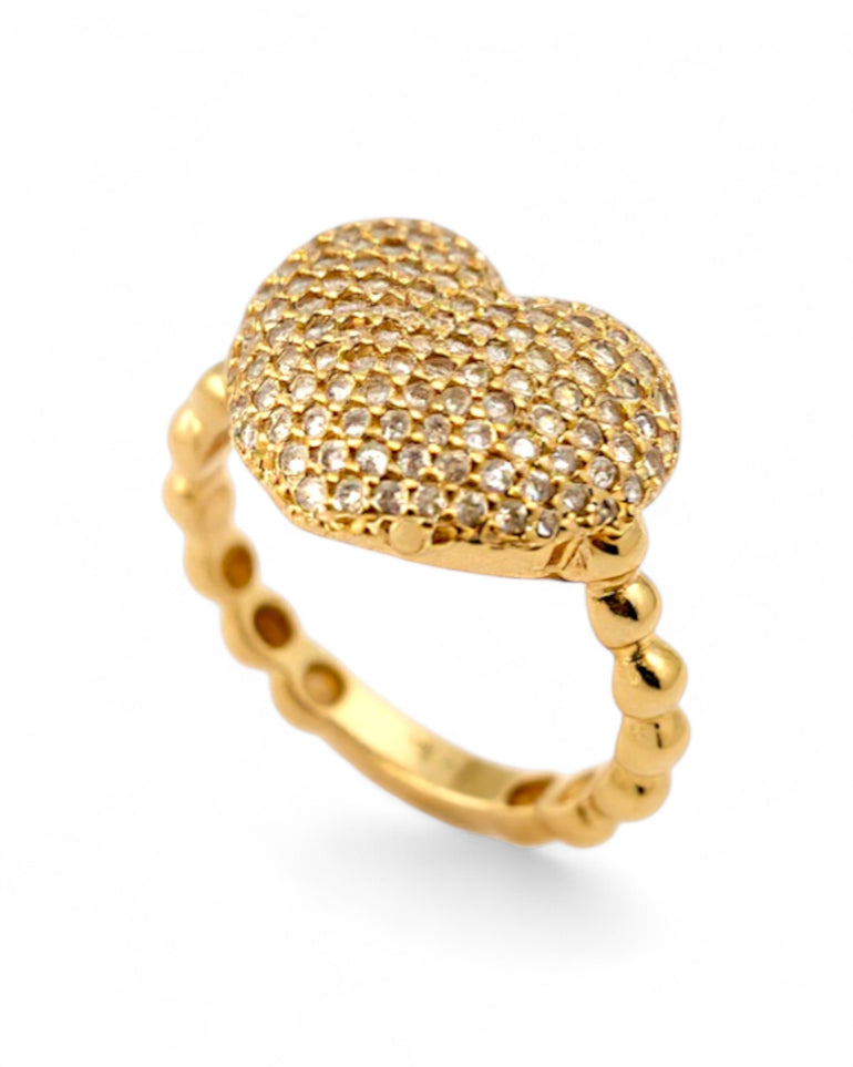 טבעת עשויה זהב צהוב בגימור מבריק, עם גוף בצורת חרוזים עגולים המקנים מראה עשיר ומקורי. במרכזה לב תלת־ממדי בולט, משובץ כולו בזירקונים קטנים צפופים היוצרים אפקט מנצנץ ונועז מכל זווית. עיצוב שמשלב בין חן ילדותי לעידון יוקרתי, ומתאים למי שאוהבת טבעות בסטייטמנט ברור.