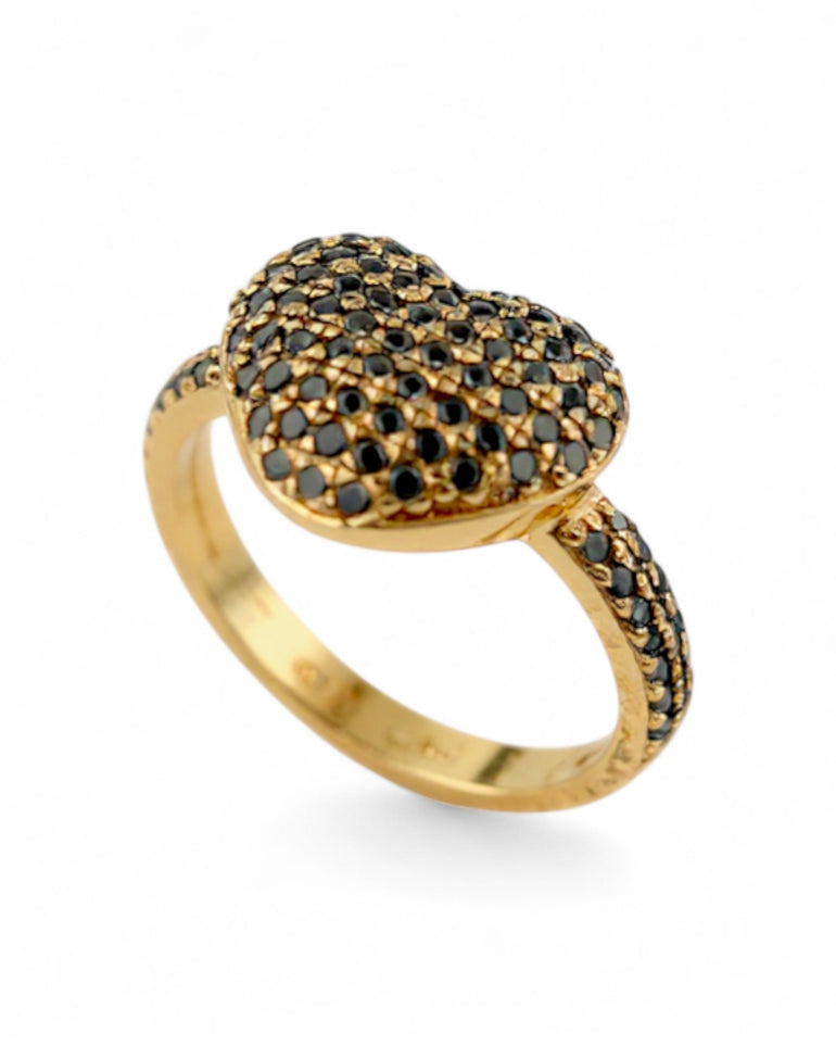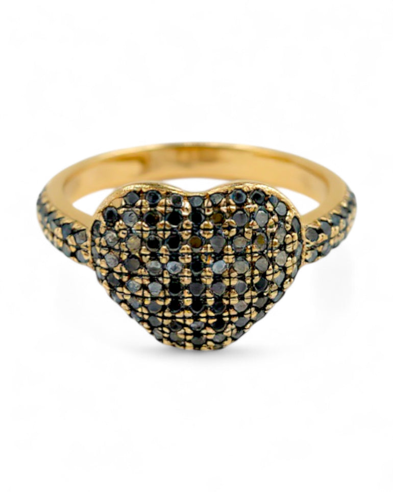 טבעת לב משובצת אבנים שחורות | שיבוץ זירקונים | זהב צהוב 14 קראט | דגם מיקה