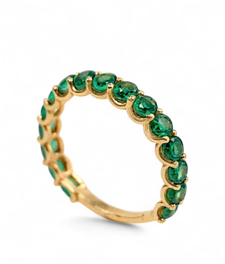 טבעת מעוצבת בזהב צהוב עם שיבוץ מלא של אבני חן ירוקות עגולות, המקיפות את כל היקף הטבעת ליצירת מראה עשיר ונוצץ מכל כיוון. כל אבן משובצת בתוך תושבת פתוחה עם ארבע שיניים זהובות, המדגישות את הצבע העמוק ומאפשרות חדירת אור לזוהר מרבי. המבנה האחיד והמדויק מעניק לטבעת איזון מושלם בין אלגנטיות לנוכחות.