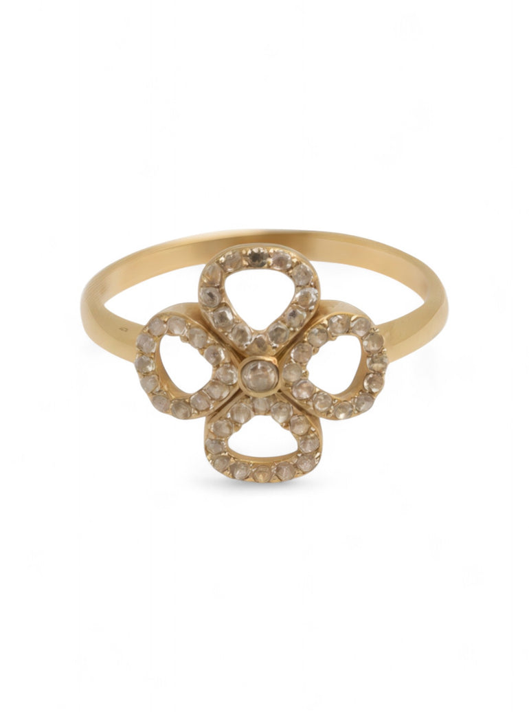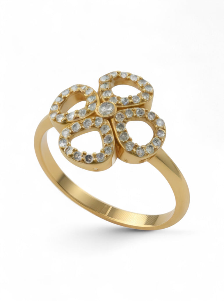 טבעת פרח ייחודית בעלת ארבע מסגרות בצורת טיפה, משובצות בזירקונים בוהקים לאורך כל שפתן, ובמרכזן אבן עגולה נוצצת. עיצוב תלת־ממדי מרשים בשילוב חישוק זהב צהוב 14 קראט חלק ומבריק, ליצירת מראה יוקרתי ונשי המתאים לכל אירוע.