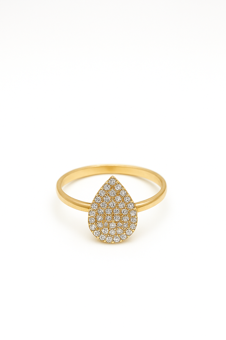 טבעת מעוצבת בעבודת יד מוקפדת, עשויה זהב צהוב 14 קראט בגימור מבריק. ראשה מעוצב בצורת טיפה אלגנטית, משובצת בצפיפות בעשרות אבני זירקון קטנות שמוסיפות לה ברק רב ונוכחות ייחודית. גוף הטבעת חלק ודקיק, מה שמדגיש את מרכז העיצוב ומעניק תחושת קלילות לצד תחושת יוקרה. אידיאלית לנשים שמחפשות תכשיט מיוחד, נוצץ ולא שגרתי.
