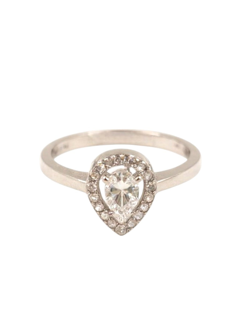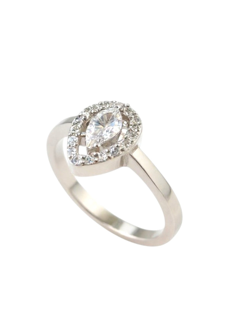 טבעת אלגנטית בעיצוב קלאסי ועדין, עם אבן מרכזית בצורת טיפה הפונה כלפי מטה, מוקפת הילה צפופה של זירקונים עגולים קטנים שמעניקים לה מסגרת בוהקת ונוצצת. גוף הטבעת חלק ונקי, בגימור מבריק שמבליט את המרכז ומשלים את המראה היוקרתי. העיצוב מתאים במיוחד למי שמעדיפה קווים ברורים ונוכחות עדינה אך מרשימה.