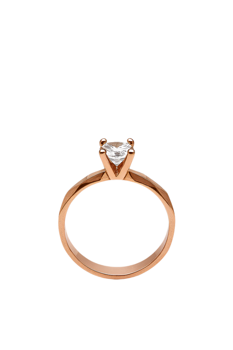 טבעת ייחודית בעיצוב סוליטר, עשויה זהב רוז גולד 14 קראט בגימור מט יוקרתי. גוף הטבעת מעוצב בגאומטריה זוויתית וחזקה, המשווה לה מראה מודרני ונועז. במרכז משובצת אבן זירקון עגולה וגדולה, בשיבוץ פתוח של 4 שיניים, שמאפשר לאור לחדור ולשדר זוהר מרשים במיוחד. שילוב בין קלאסיקה לנועזות – מושלם למי שמחפשת תכשיט עם נוכחות אישית.