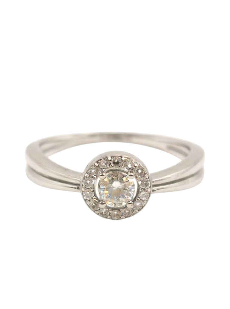 טבעת זהב בעיצוב עגול, קלאסי ומעודן, עם אבן מרכזית עגולה המשובצת בתוך מסגרת צפופה של זירקונים מנצנצים. גוף הטבעת חלק ואחיד בקווים רכים, כאשר השיבוץ הגבוה של האבן המרכזית יוצר נוכחות יוקרתית ומושכת. עיצוב זה מעניק לטבעת מראה על-זמני עם טאץ' מודרני ומוקפד.
