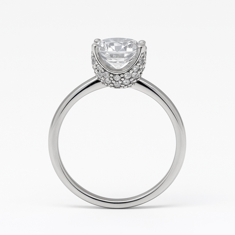 במרכזה משובצת אבן זירקון עגולה גדולה, הנתמכת ב־4 שיניים זהב דקות ואלגנטיות – המבליטות את האבן ויוצרות נוכחות זוהרת במיוחד.