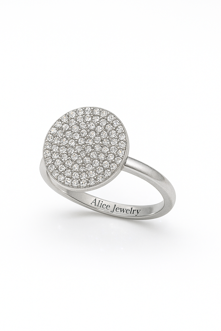 טבעת מעוצבת עם נוכחות ייחודית ומודרנית, עשויה זהב לבן 14 קראט בגימור חלק ומבריק. במרכזה פלטה עגולה רחבה, המשובצת בעשרות זירקונים קטנים בצפיפות גבוהה, היוצרים מראה נוצץ במיוחד ועשיר בפרטים. הפלטה משתלבת בגוף טבעת דק ונקי, היוצר איזון בין אלגנטיות קלאסית לבין סטייל עדכני ובולט. מתאימה לנשים שאוהבות תכשיטים עם נוכחות וזוהר.