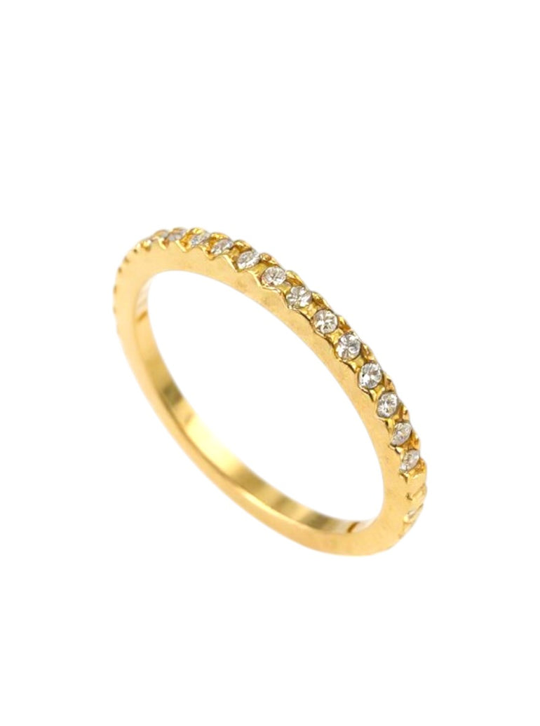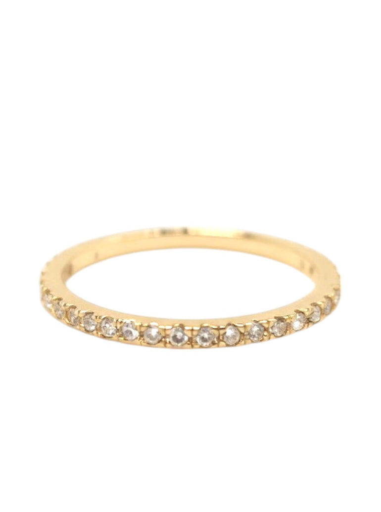 טבעת בעיצוב קלאסי ואלגנטי, עם שורת זירקונים עגולים המשובצים בזהב צהוב לאורך חלקה העליון של הטבעת. השיבוץ הצמוד יוצר אפקט של קו מנצנץ ועדין, שמעניק לטבעת מראה מהודר אך נקי. המבנה הדק והמדויק, יחד עם הגימור המבריק, הופכים אותה לטבעת אידיאלית כשכבת חיזוק לצד טבעת עיקרית או כטבעת בפני עצמה.