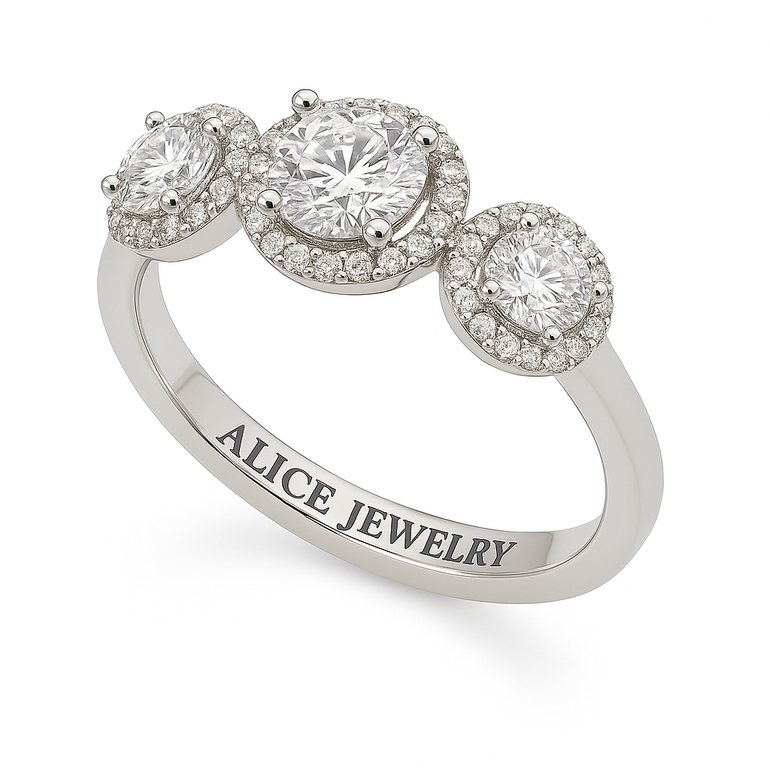 טבעת יוקרתית בעיצוב שלישיית היילו אלגנטית, עם שלוש אבני זירקון עגולות – אבן מרכזית גדולה ושתי אבנים צדדיות קטנות יותר, כאשר כל אחת מהן מוקפת במסגרת עגולה צפופה של זירקונים קטנטנים ונוצצים. גוף הטבעת עשוי זהב לבן מבריק 14 קראט, חלק וקלאסי, שמבליט את מרכז העיצוב ומעניק לטבעת מראה מרשים, סימטרי ונשי במיוחד.