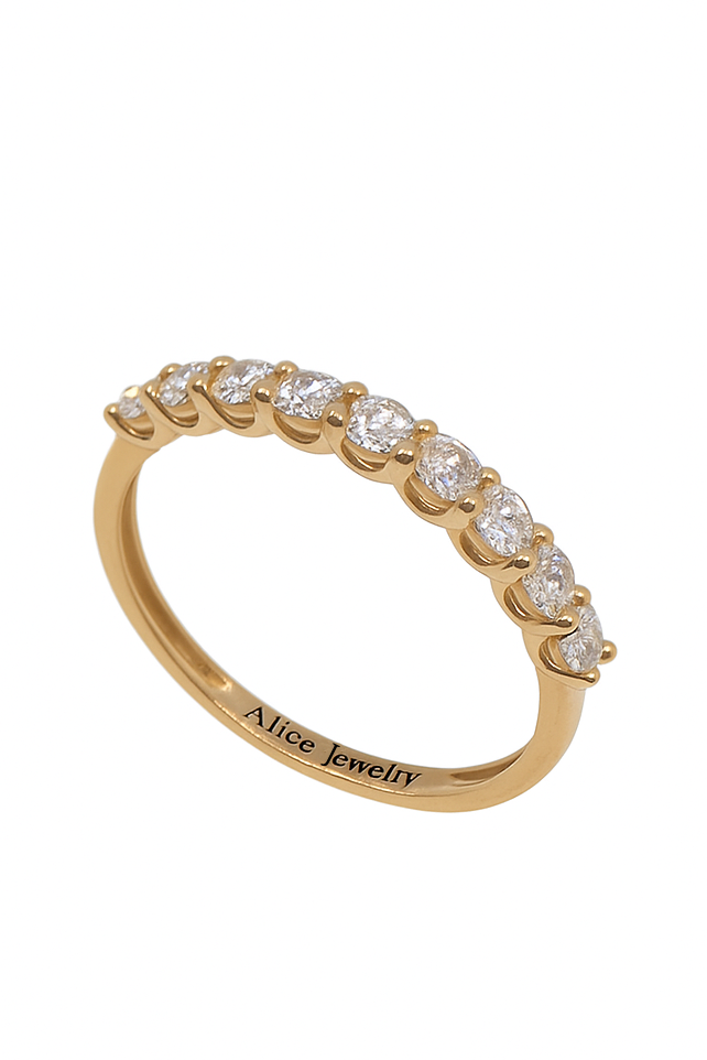 טבעת זהב קלאסית ועדינה, משובצת בשורת זירקונים נוצצים בחיתוך עגול, היוצרים מראה אחיד וזוהר לאורך החלק העליון של הטבעת. השיבוץ מדויק, כאשר כל אבן מוחזקת בתוך תושבת מעוגלת שמשלימה את הקימור הטבעי של הטבעת. העיצוב יוצר תחושת רצף ונצנוץ עדין מכל זווית, ומתאים גם כטבעת עצמאית וגם כשילוב לצד טבעת נוספת.
