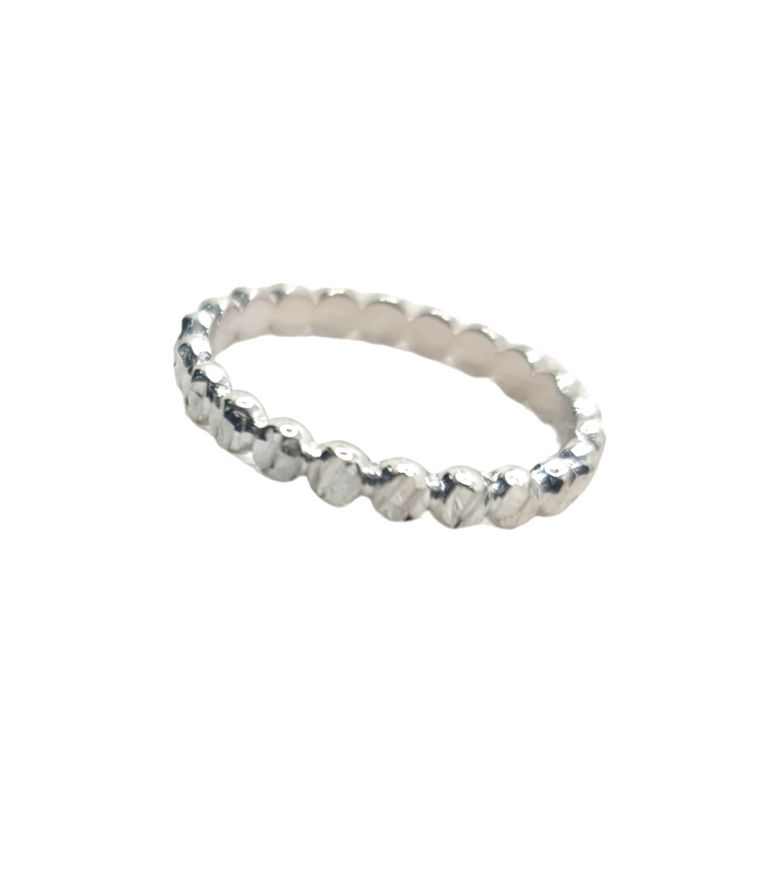 טבעת נישואין בעיצוב עדין אך מרשים, עם טקסטורת חרוזים אחידה המקיפה את כל ההיקף. כל חרוז משויף באופן המעניק ברק גבוה וזוויות מחזירות אור – מבלי לכלול שיבוצים, מתקבל מראה נוצץ ואלגנטי. טבעת זו מתאימה לנשים שמחפשות עיצוב קליל אך מלא נוכחות, עם טוויסט גאומטרי מקורי.