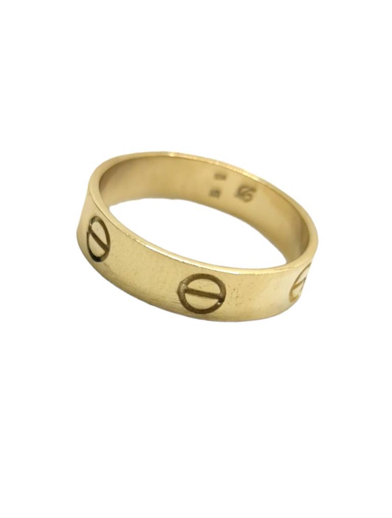טבעת נישואין רחבה מעט, בעיצוב סימטרי ומדויק עם חריטות עגולות המדמות ראשי ברגים מסביב לכל ההיקף. רוחבה מעניק לה נוכחות אלגנטית ונינוחה על היד, בשילוב עם גימור חלק ונעים למגע. העיצוב שואב השראה מחיבורים חזקים ונצחיים, ומתאים למי שמעדיפה טבעת עם אמירה עיצובית ייחודית אך אלגנטית.