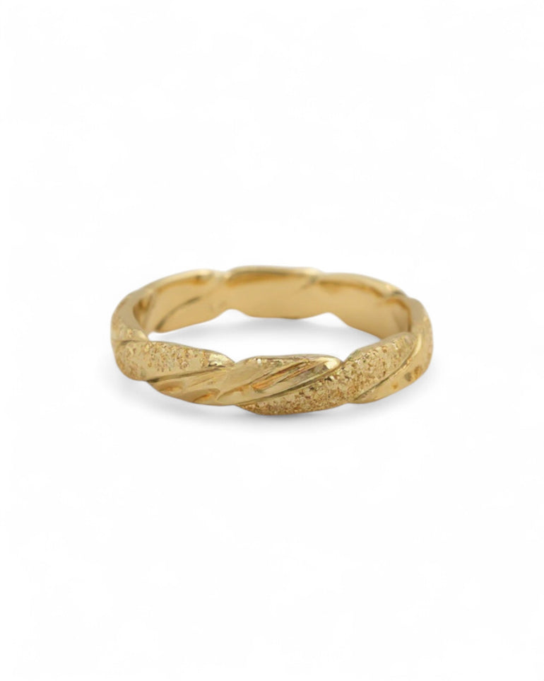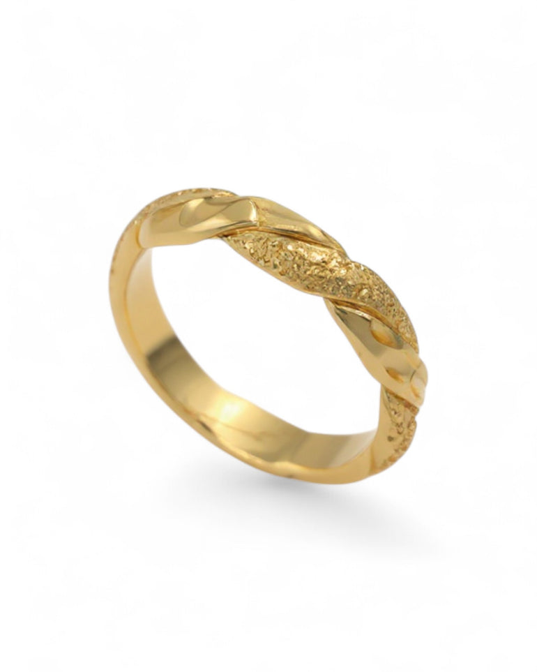 טבעת נישואין אלגנטית בעיצוב קלוע, המשלבת בין חוליות מוזהבות חלקות לבין מקטעים בעלי טקסטורת נצנוץ עדינה. המבנה הקלוע מעניק לטבעת תנועה ויזואלית ייחודית, והנצנוץ מוסיף ברק יוקרתי שמבליט את העיצוב בצורה מושלמת. טבעת מיוחדת, קלאסית ועדינה — מתאימה לשימוש יומיומי וגם לאירועים.