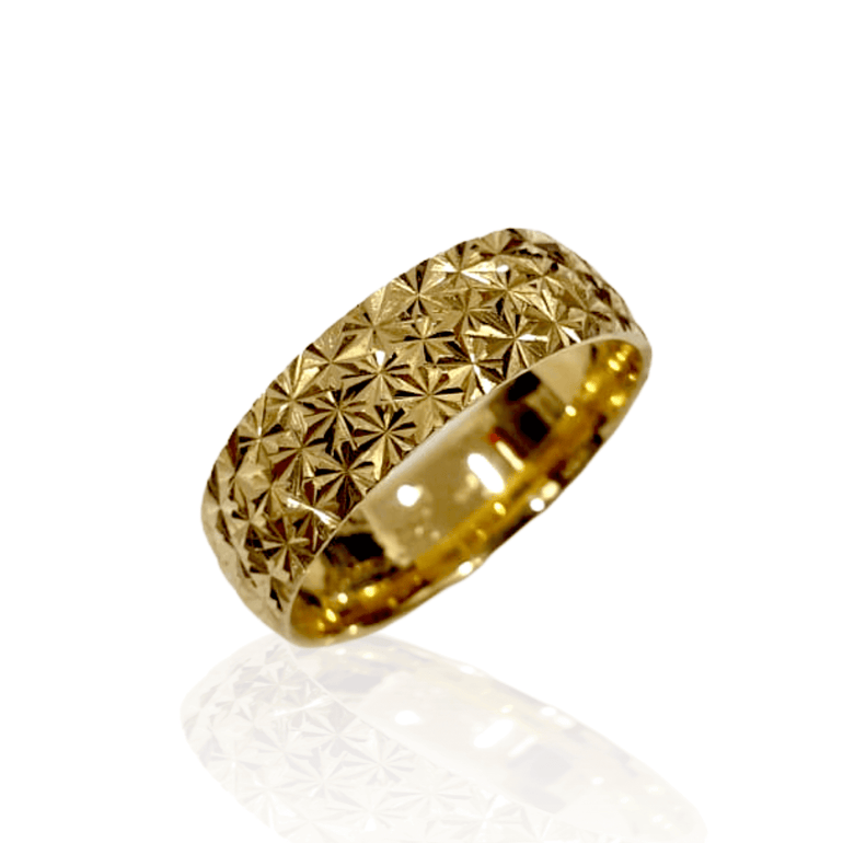 טבעת נישואין לנשים מזהב צהוב 14 קראט ובחיתוך לייזר מעוצב