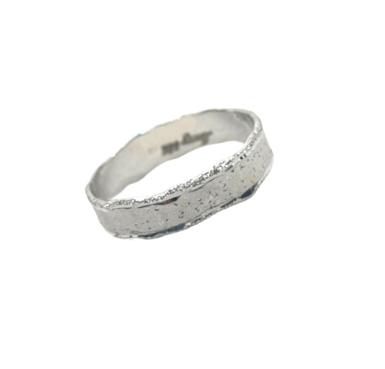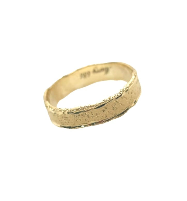 טבעת נישואין בעיצוב מקורי וייחודי, עם טקסטורת נצנוץ אחידה ומעליה חריטה עדינה בסגנון דקורטיבי הנמתחת לרוחב כל גוף הטבעת. שולי הטבעת מוגבהים ומלוטשים קלות, להדגשת המרכז החרוט. הטבעת שומרת על מראה רחב אך קלאסי, ומתאימה במיוחד למי שמחפשת עיצוב בעל נוכחות אך שקט ואותנטי.