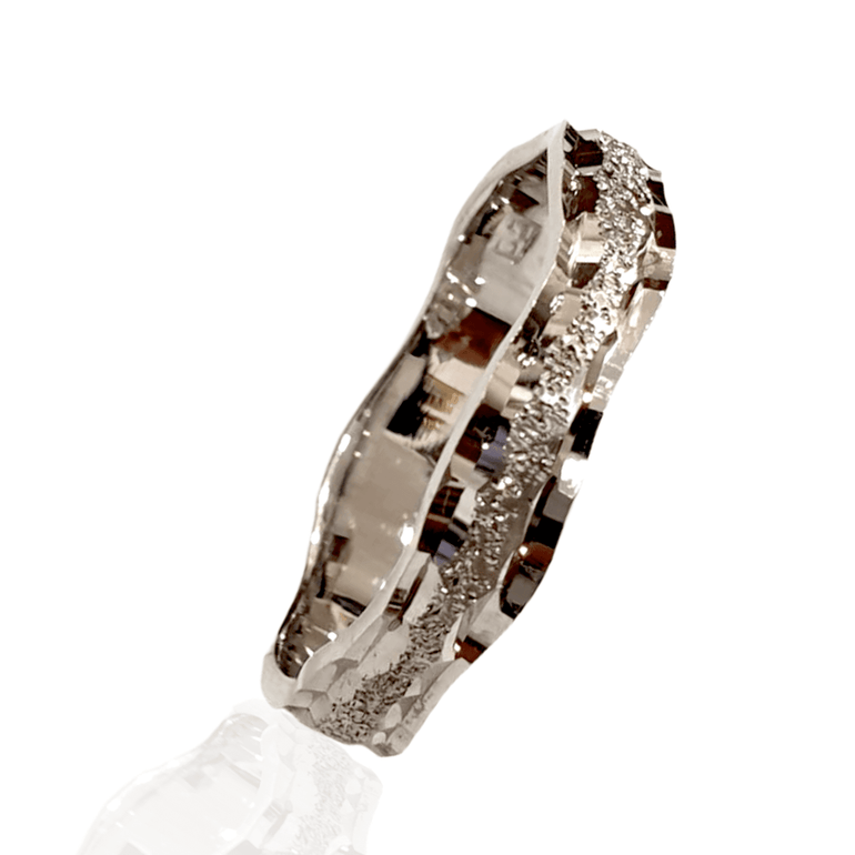 טבעת נישואין לנשים מזהב לבן 14 קראט ובחיתוך מעוצב ומיוחד בגבולות הטבעת
