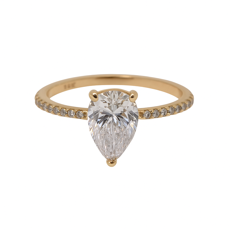 במרכזה משובצת אבן זירקון גדולה בצורת טיפה (Pear Cut) – לוכדת את האור בצורה מרהיבה, ומשובצת בשלוש שיניים זהובות קלאסיות.