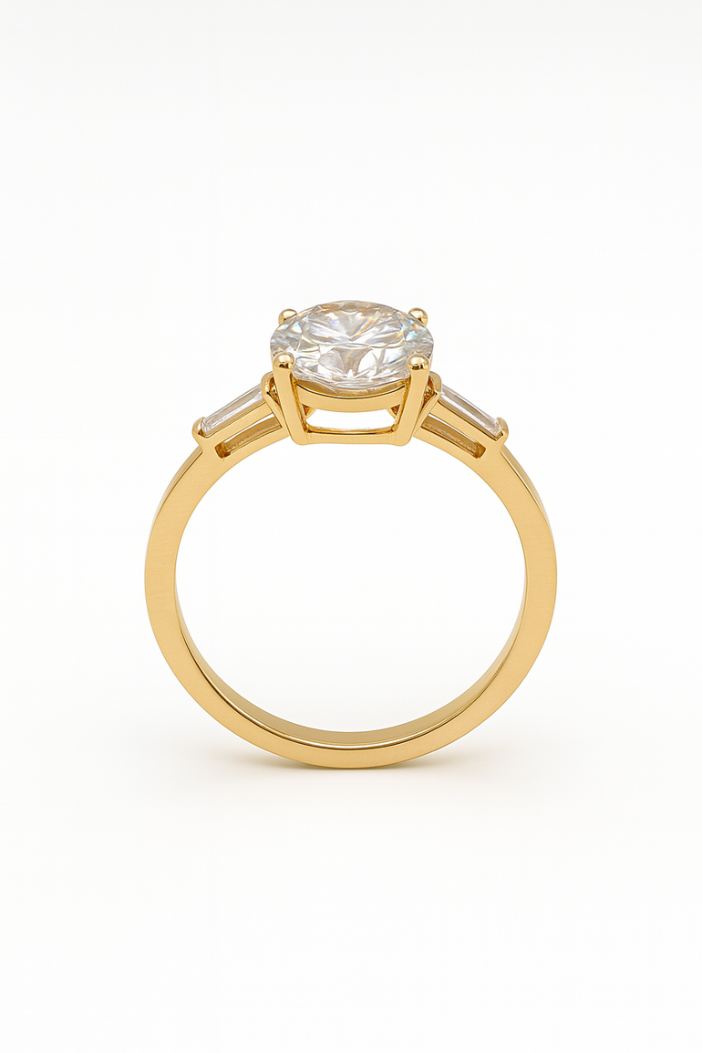 טבעת סוליטר יוקרתית ומאוזנת בקווים הקלאסיים, עם אבן מרכזית עגולה ובוהקת הנתונה בשיבוץ ארבעה שיניים מדויקים. לצידי האבן שובצו שתי אבני באגט מוארכות ומלוטשות, המעניקות לטבעת טוויסט מודרני, מעודן ואלגנטי. השילוב בין המרכז העוצמתי לאלמנטים הצידיים האלגנטיים יוצר טבעת עוצמתית אך הרמונית – מושלמת כטבעת הצהרה או הצעת נישואין קלאסית.