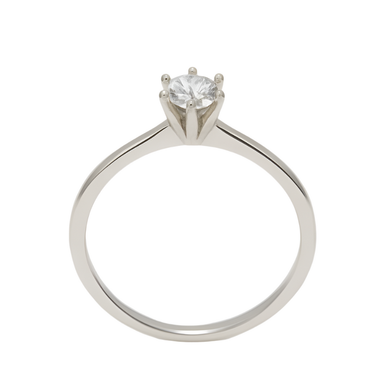 טבעת סוליטר מרשימה ואלגנטית בעיצוב נקי, עם אבן זירקון עגולה גדולה המשובצת ב־6 שיניים מוגבהות המעניקות נוכחות וביטחון לאבן המרכזית. גוף הטבעת עשוי זהב לבן 14 קראט בגימור מבריק וחלק, בעובי עדין ונוח. העיצוב הגבוה מאפשר לאור לחדור אל האבן בזוויות שונות ולמקסם את הברק.