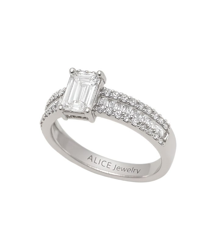 • אבנים | זירקון מרכזי בחיתוך אמרלד, שיבוץ צדדי כפול של זירקונים קטנים