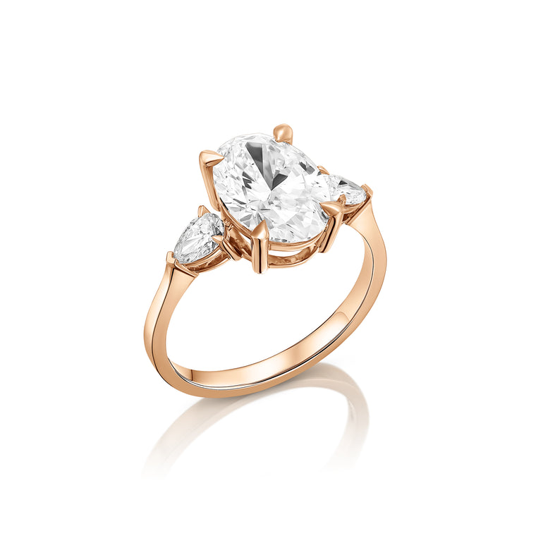 טבעת יוקרתית ומלאת נוכחות, עם יהלום מרכזי אובלי במשקל 3.03 קראט ושני יהלומי צד בצורת טיפה במשקל כולל של 0.42 קראט, להשלמת מראה סימטרי והרמוני. השיבוץ הגבוה מאפשר חדירת אור מרבית ליהלומים ומעניק ברק עוצמתי ומראה מרשים במיוחד. טבעת אידיאלית להצעת נישואין או מתנה בלתי נשכחת.