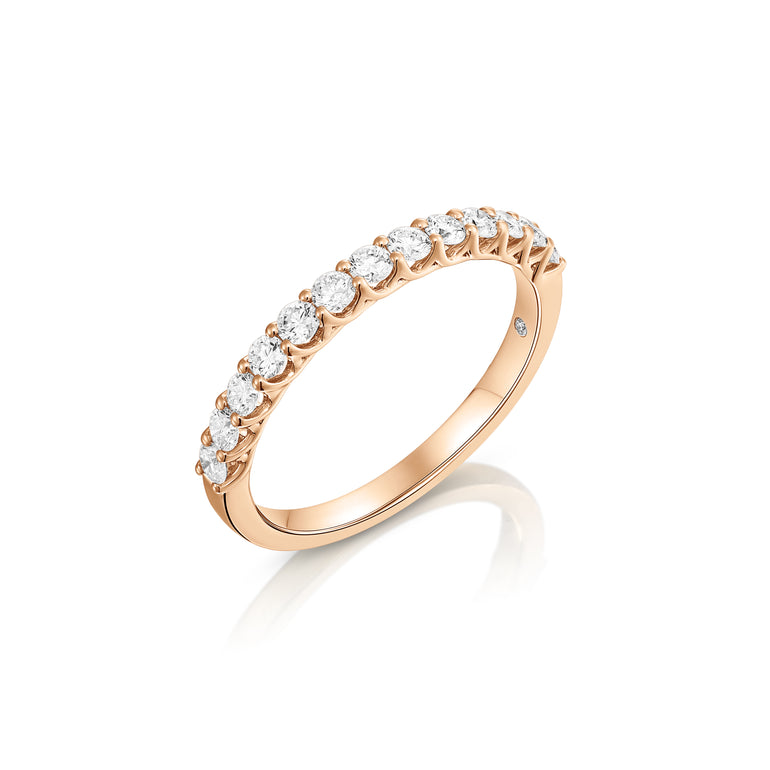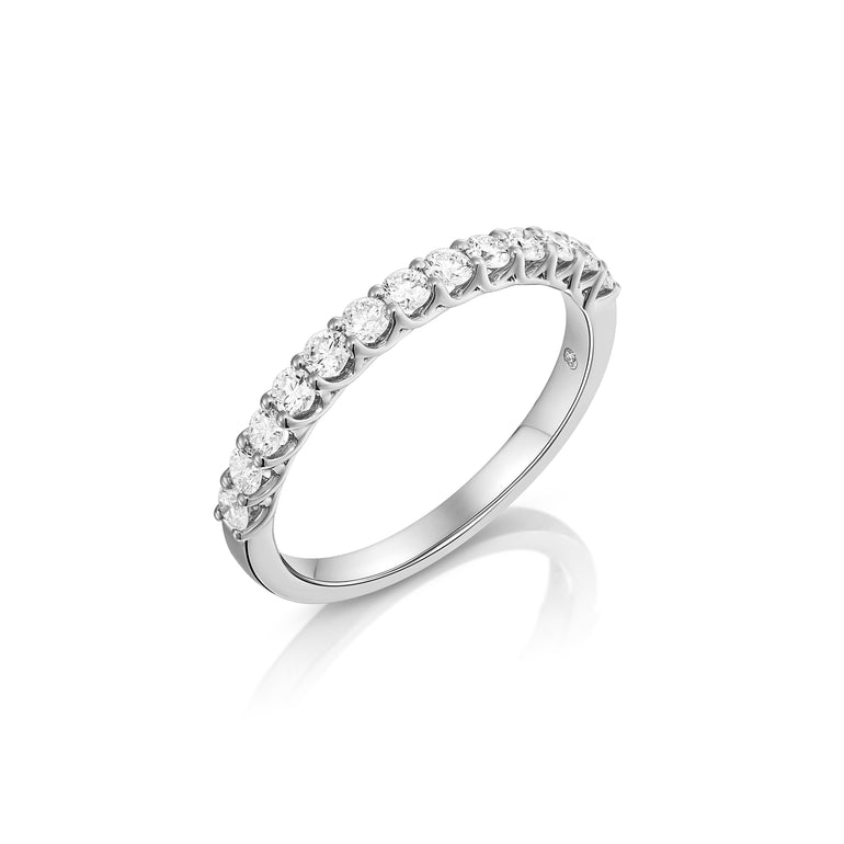 טבעת חצי נצח קלאסית ועדינה, משובצת ב-13 יהלומי מעבדה עגולים באיכות EF-VVS במשקל כולל של 0.47 קראט. השיבוץ הרציף לאורך החזית יוצר מראה זוהר ונקי, ומעניק לטבעת ברק יוקרתי שמתאים לענידה יומיומית או כטבעת אירוסין עדינה.
