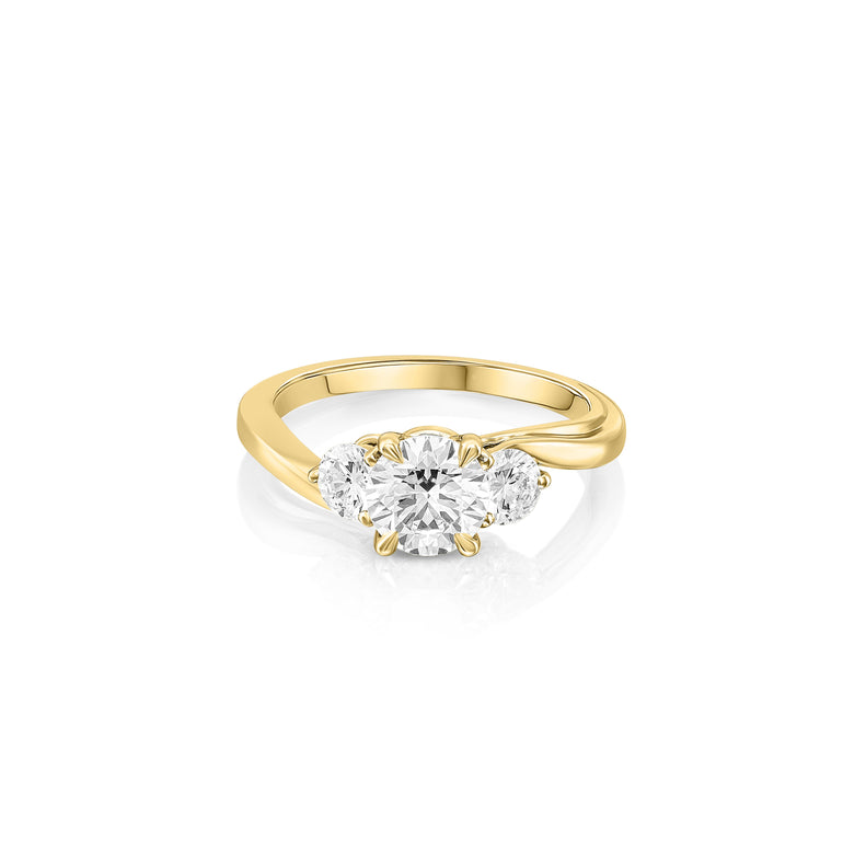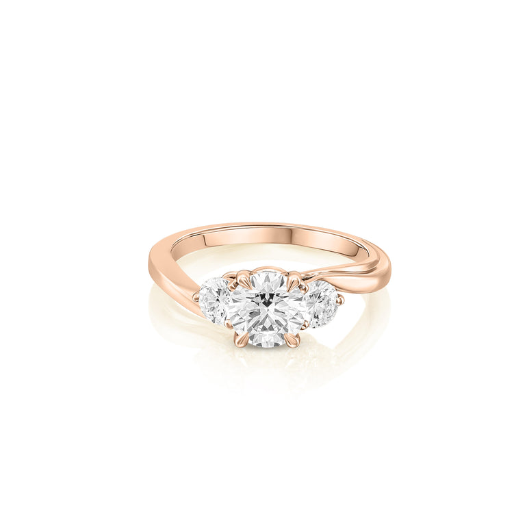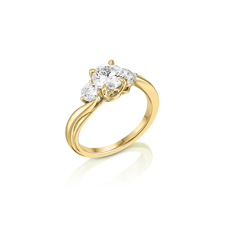 טבעת קלאסית ומעודנת בעיצוב טוויסט רך, עם יהלום מרכזי עגול במשקל 1.03 קראט ושני יהלומי צד עגולים במשקל כולל של 0.58 קראט. היהלומים באיכות EF-VVS, מעניקים ברק עוצמתי ומראה יוקרתי שמתאים ליום יום וגם לאירועים מיוחדים.