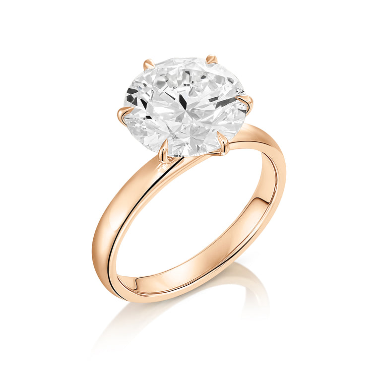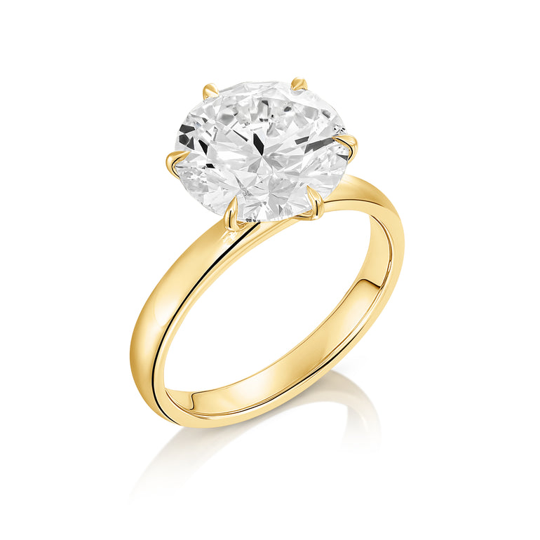 טבעת סוליטר אלגנטית בעיצוב נקי ועל-זמני. יהלום מעבדה עגול במשקל 5.01 קראט משובץ בטפרים עדינים שמבליטים את הברק ומאפשרים לאור לחדור מכל זווית. החישוק החלק והמבריק מדגיש את האבן המרכזית ויוצר מראה יוקרתי ומרשים.