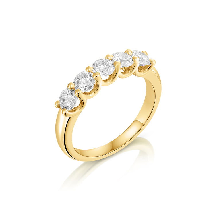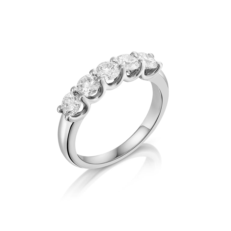 טבעת קלאסית ועדינה עם חמישה יהלומי מעבדה עגולים, משובצים לאורך החישוק בעיצוב פתוח שמאפשר כניסת אור מקסימלית ומדגיש את הברק הטבעי של האבנים. השילוב של חישוק זהב לבן מבריק והאבנים הנוצצות יוצר מראה יוקרתי שמתאים לענידה יומיומית או כאקססורי אלגנטי לאירועים מיוחדים.