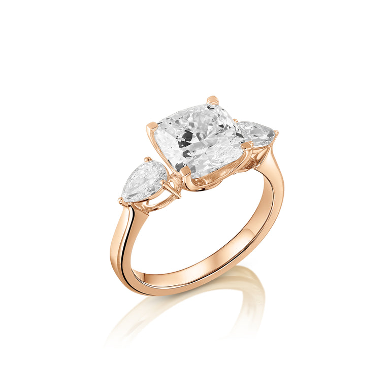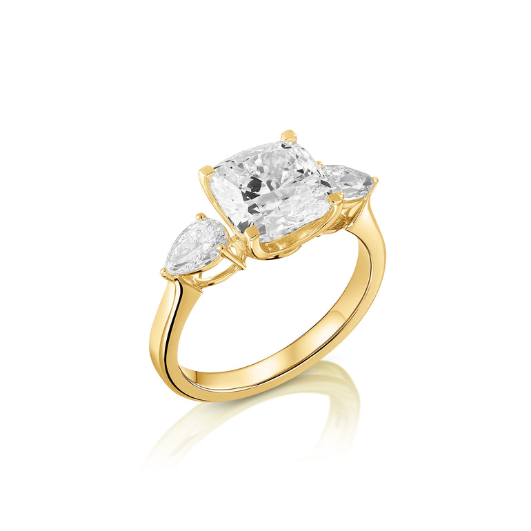 טבעת שלישייה קלאסית ומרהיבה, עם יהלום מרכזי מרשים בחיתוך קושן במשקל 3.29 קראט המשובץ בטפרים עדינים המדגישים את הברק והעומק של האבן. משני צדדי היהלום המרכזי משובצים זוג יהלומי מעבדה בחיתוך טיפה במשקל כולל של 0.649 קראט, המשלימים את העיצוב ומעניקים לטבעת מראה סימטרי, יוקרתי ורומנטי. שילוב הזהב והיהלומים בדרגת צבע EF וניקיון VVS מבטיח מראה עוצר נשימה שמושך את כל המבטים.