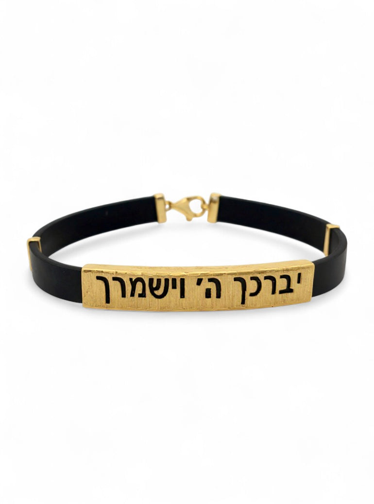 צמיד ייחודי בעיצוב אלגנטי המשלב רצועת גומי איכותית בצבע שחור עם לוחית זהב צהוב 14 קראט, מעוטרת בחריטת לייזר מדויקת של הפסוק "יברכך ה' וישמרך".