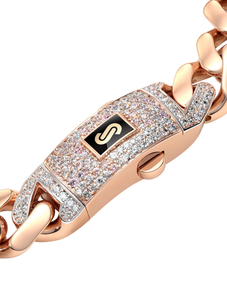 צמיד מונקו בעיצוב נקי וחלק בזהב רוז 14 קראט, עם חוליות רחבות ומלוטשות למראה גברי ומאוזן. הסוגר המעוצב מגיע עם שיבוץ עדין שמוסיף נגיעה יוקרתית מבלי להשתלט על העיצוב, מה שיוצר איזון בין אלגנטיות ונוכחות יומיומית.