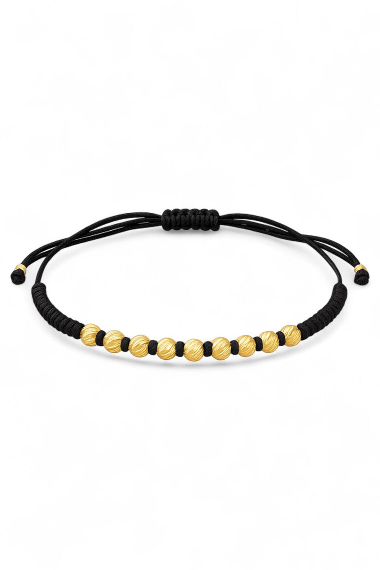 צמיד מקרמה יוקרתי בעבודת שזירה מדויקת, המשלב חוט שחור איכותי עם חרוזי זהב צהוב 14 קראט בעלי טקסטורה מחורצת עדינה.