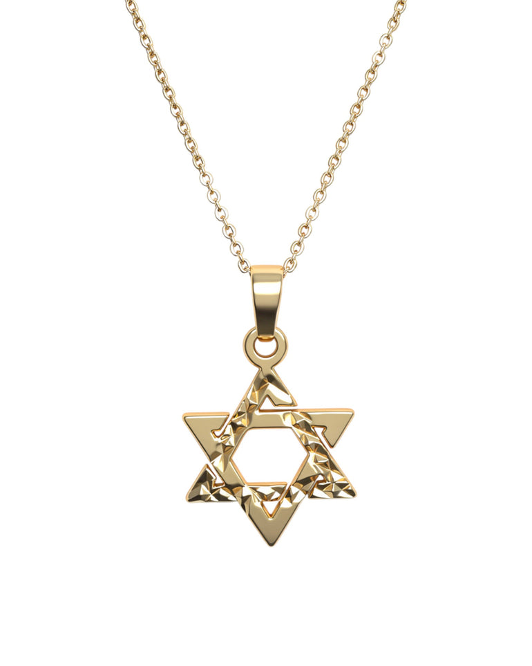 שרשרת אלגנטית עם תליון מגן דוד חלול בעיצוב נקי, הכולל טקסטורה גיאומטרית עדינה המוסיפה עומק וברק ייחודי.