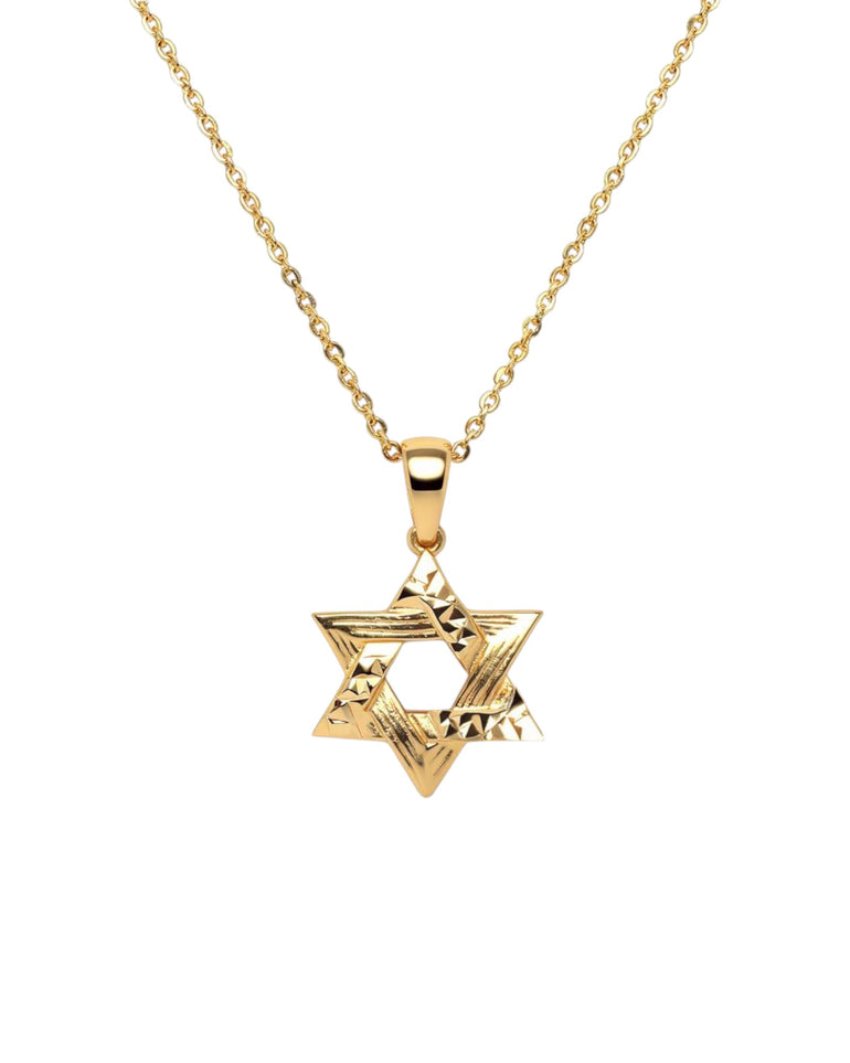 שרשרת אלגנטית עם תליון מגן דוד בעיצוב משולב הכולל חריצים וטקסטורה גיאומטרית עדינה, היוצרים משחקי אור וברק ייחודיים.