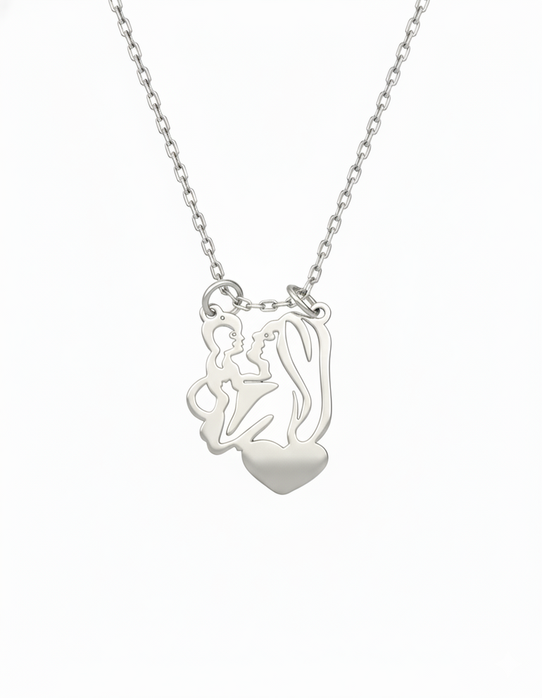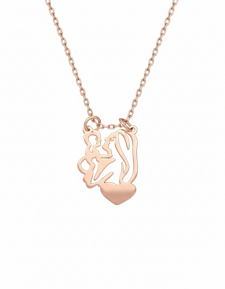 שרשרת עדינה עם תליון אמא מחזיקה תינוק בעיצוב מיוחד ומרשים, עבודת אומנות מעוצבת בקפידה עם פרט לב קטן ומקסים, שמעניקה מראה רגשי ומשמעותי ומתאימה לכל סגנון. תליון מושלם למתנה לאמא או לאישה יקרה.