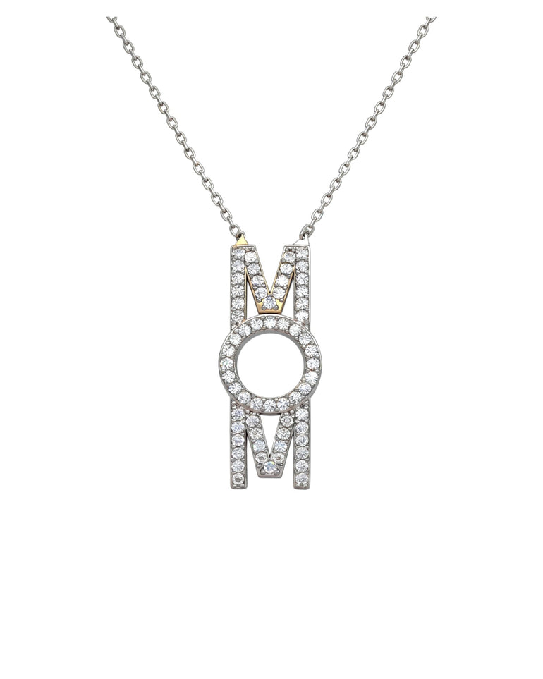 שרשרת עם תליון MOM משובץ | שיבוץ זירקונים | זהב לבן 14 קראט | דגם מיה