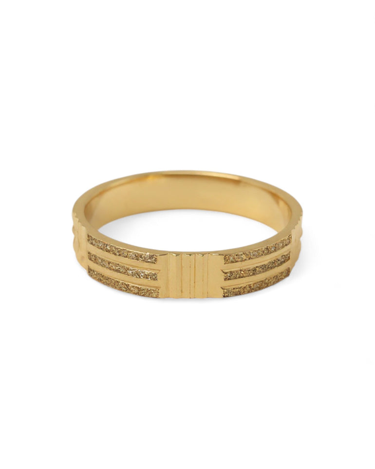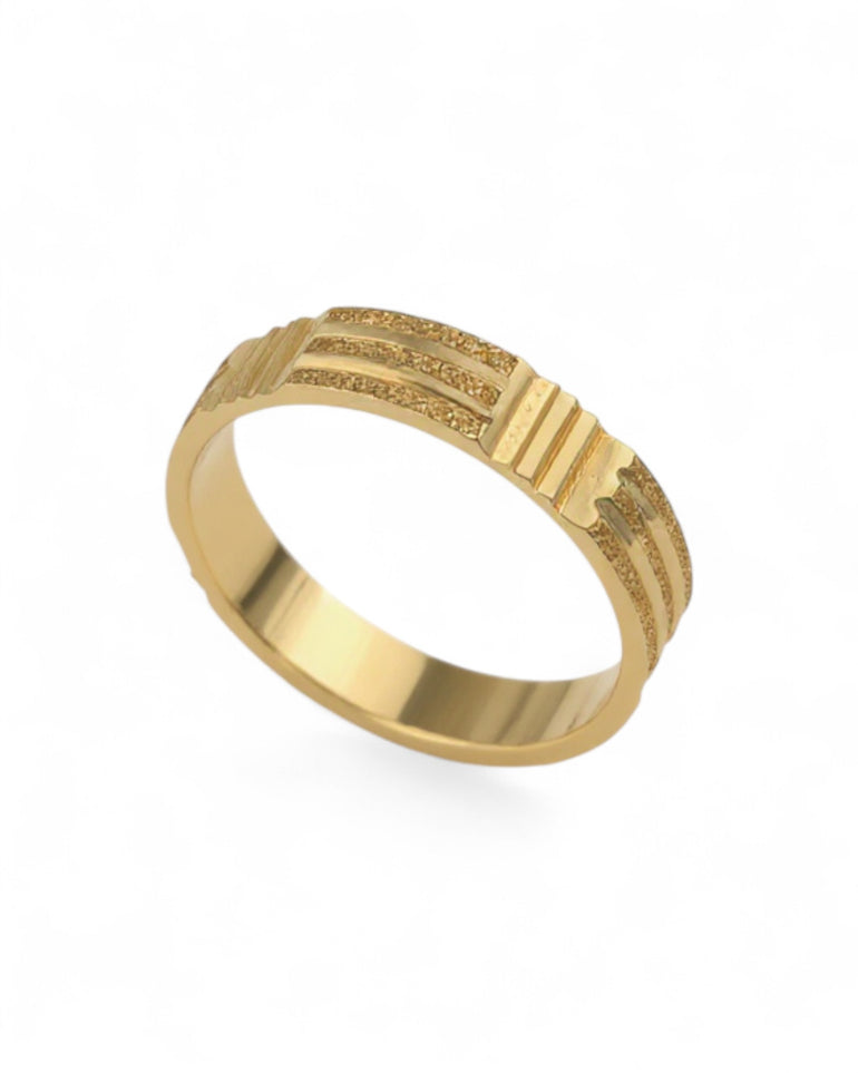טבעת נישואין בעיצוב ייחודי ומשדר כוח, המשלבת שלושה פסים דקים במראה מדורג: שני פסים עם חריטת לייזר בנצנוץ עדין, וביניהם פס זהב חלק ומבריק שיוצר קונטרסט מרשים. בצד אחד מופיע אלמנט קווי מחוספס המעניק לטבעת אופי גברי מודגש. השילוב בין הברק החלק לבין המרקם המנוצנץ יוצר מראה מרשים, יציב ומלא נוכחות — בחירה מצוינת למי שמעדיף עיצוב ייחודי אך מאוזן.