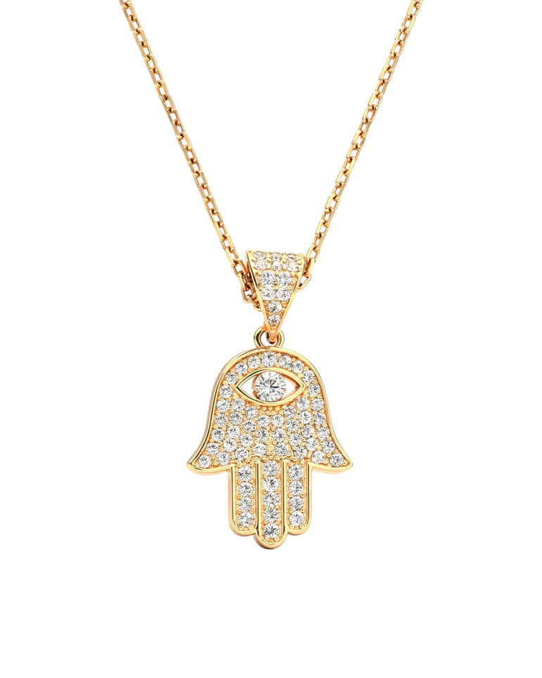 שרשרת אלגנטית עם תליון חמסה בעיצוב עדין ונקי, משובץ זירקונים לבנים ליצירת ברק אחיד ומראה יוקרתי.