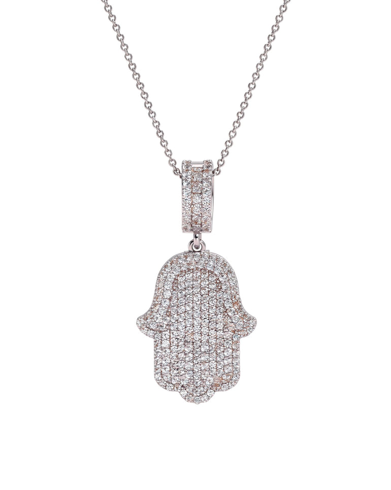 שרשרת אלגנטית עם תליון חמסה בעיצוב קלאסי ונקי, משובץ זירקונים צפופים ליצירת ברק אחיד ומראה יוקרתי.