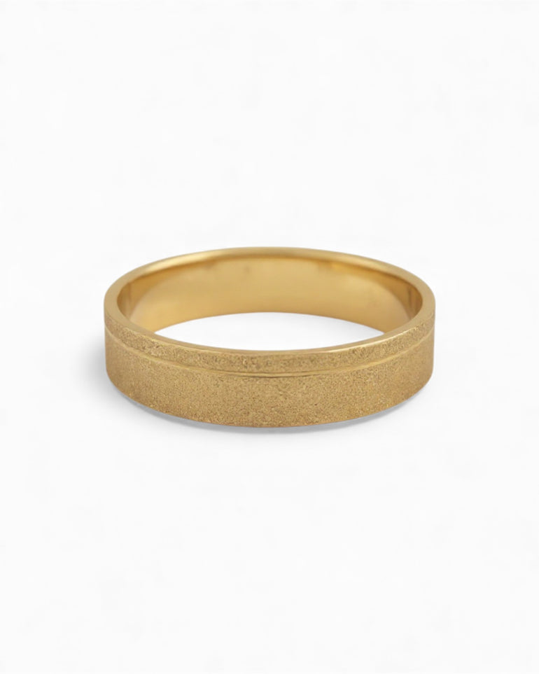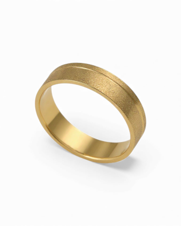 טבעת נישואין בעלת מראה ייחודי ונקי, המשלבת פס נצנוץ עדין לכל אורך ההיקף, עם קו מרכזי חלק שמדגיש את הצורה ומעניק תחושה אלגנטית ויציבה. הנצנוץ הדק נותן טאץ' מודרני אך מאופק, והחיבור בין הברק המעודן לקו המרכזי יוצר עיצוב קלאסי אך בעל אופי — מושלם לגבר שמעדיף סגנון יוקרתי אך לא מוגזם.