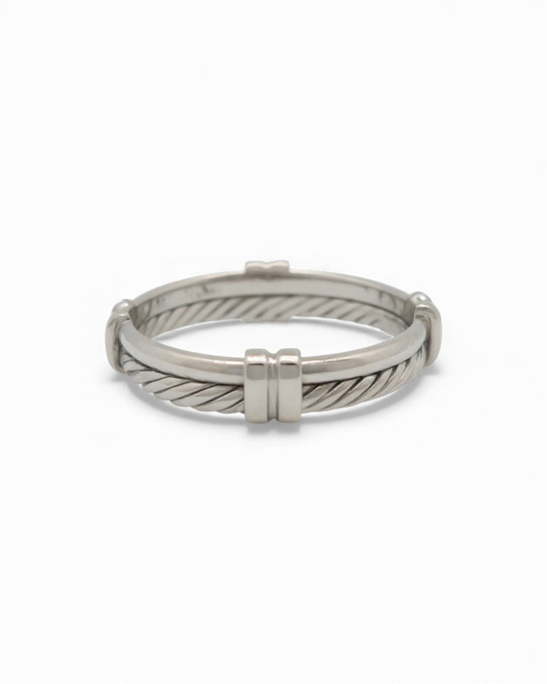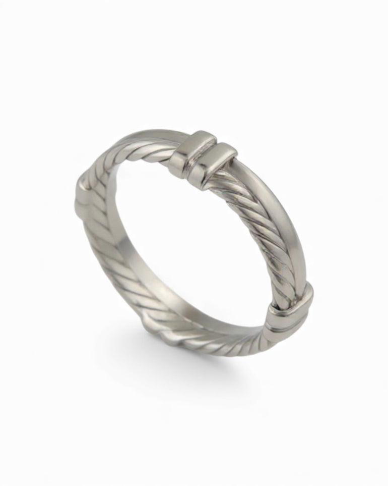 טבעת נישואין ייחודית בעיצוב חבל מפוסל, עם טקסטורה סיבובית מדויקת שמקיפה את כל היקף הטבעת ויוצרת מראה חזק, מובחן ובעל אופי. האלמנטים המחוזקים בחלק העליון והתחתון מעניקים תחושה של עבודת יד מעוצבת, ומשלבים בין מסורת לבין טוויסט מודרני. טבעת נוחה ללבישה, עשויה בגימור איכותי שמבליט את עומק הפרטים.