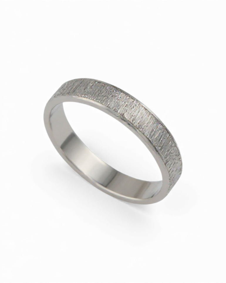 טבעת נישואין בעלת מראה גברי וייחודי, עם טקסטורת קווים מחוספסת לאורך כל החלק החיצוני שמעניקה לה אופי מודרני ומלא נוכחות. שילוב הגימור המחוספס עם דפנות חלקות יוצר איזון מדויק בין קשיחות לאלגנטיות, ומתאים לגבר שמעדיף עיצוב נקי אבל לא שגרתי. נוחה לענידה יומיומית ועמידה במיוחד.