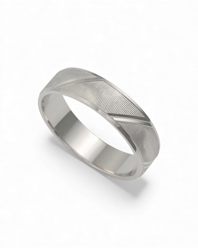 טבעת נישואין בעיצוב מדויק ונקי, עם דפנות ישרות ומראה מודרני. חלקה העליון מעוטר בחריטת לייזר אלכסונית היוצרת טקסטורה ליניארית עדינה, מופרדת בקווים מבריקים המקנים עומק ודיוק. השילוב בין המשטחים המלוטשים לבין הטקסטורה החרוטה יוצר מראה מאופק אך מרשים — אידיאלי למי שמעדיף קלאסיקה עם אופי.