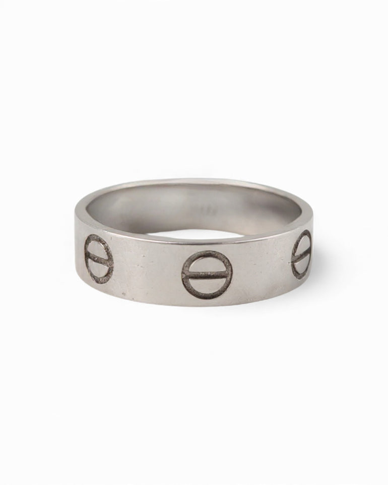 טבעת נישואין רחבה ומחוספסת בסגנון מודרני, עם עיצוב “ברגים” חרוטים שמעניקים לה מראה טכני ומינימליסטי. המבנה הישר והנקי מדגיש את הגוון הקר של זהב הלבן, והברק המלוטש יוצר נוכחות מרשימה מבלי להיות מוגזמת. טבעת קלאסית עם טאץ' עדכני שמתאימה לגברים שמעדיפים עיצוב חזק ומדויק.