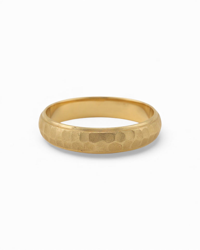 טבעת מזהב צהוב בעיצוב בעל נוכחות שקטה אך מובחנת, עם טקסטורת פטיש עדינה לכל אורך ההיקף. המשטח המיוחד יוצר משחק אור מחוספס-מעודן, כזה שמעניק לטבעת אופי גברי מבלי להיות עמוס או בולט מדי. הקנטים המלוטשים משאירים קו נקי שמאזן את המרקם המרכזי ומשווה לטבעת מראה אלגנטי, יציב ויוקרתי — בחירה מצוינת למי שמעדיף סגנון קלאסי עם טיפה אופי נוסף.