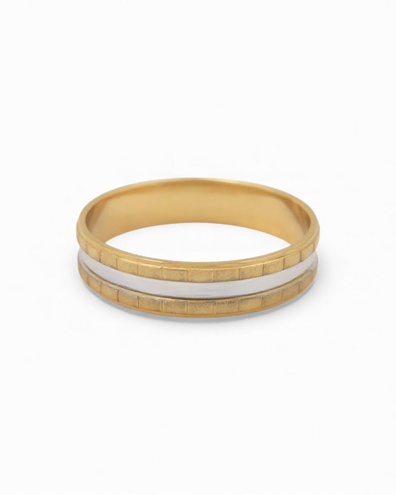 טבעת נישואין בגימור ייחודי המשלב זהב צהוב מבריק עם פס מרכזי מזהב לבן, המודגש במסגרת חריצים מלבניים מסודרים לכל היקפו. העיצוב הגיאומטרי מעניק לטבעת נוכחות מאופקת אבל מדויקת, עם תחושה מודרנית ונקייה שמתאימה למראה יומיומי או חגיגי כאחד. נוחה לענידה ממושכת ומיוצרת בעבודת גימור קפדנית.