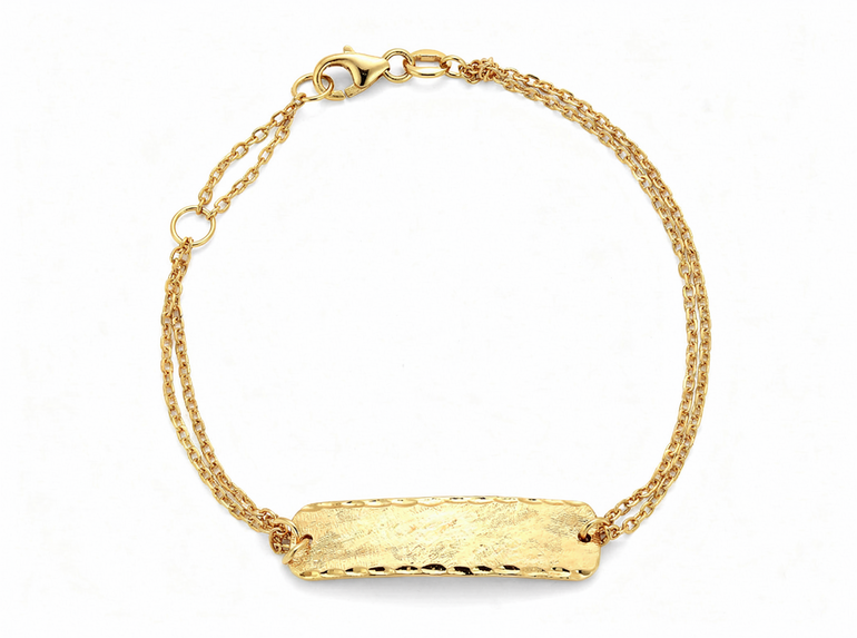 צמיד זהב לילדים בעיצוב ייחודי ועדין, עשוי זהב צהוב 14 קראט. במרכז הצמיד פלטה מלבנית עם טקסטורה מחוספסת עדינה, המעניקה מראה מיוחד ושונה, בשילוב שרשרת כפולה ודקה לנוחות וקלילות על היד. הצמיד כולל שתי אפשרויות סגירה: סגירה בעיגול הקצה ליצירת אורך ארוך יותר, או סגירה בעיגול הפנימי לקבלת צמיד קצר יותר עם שובל עדין.